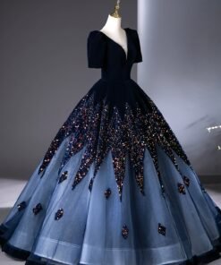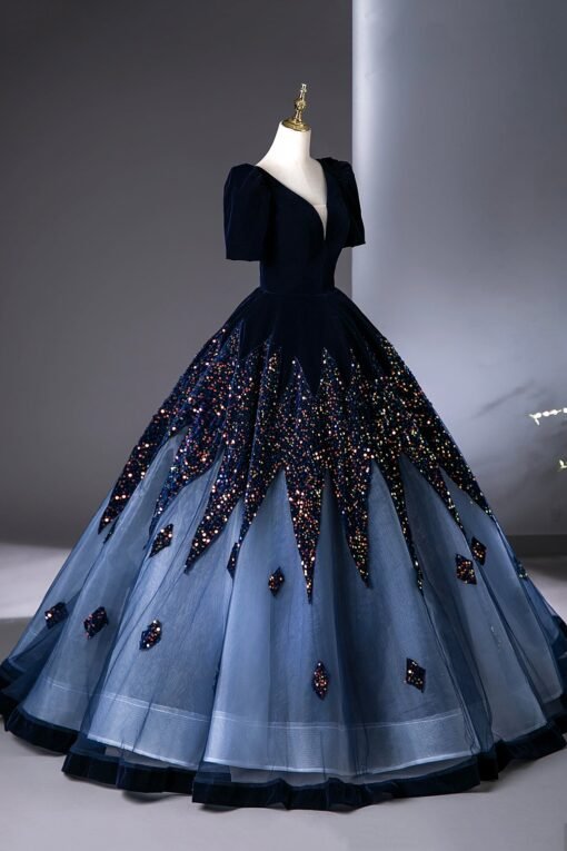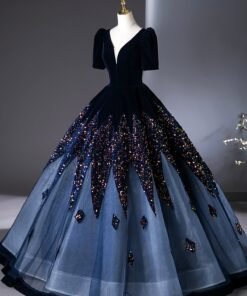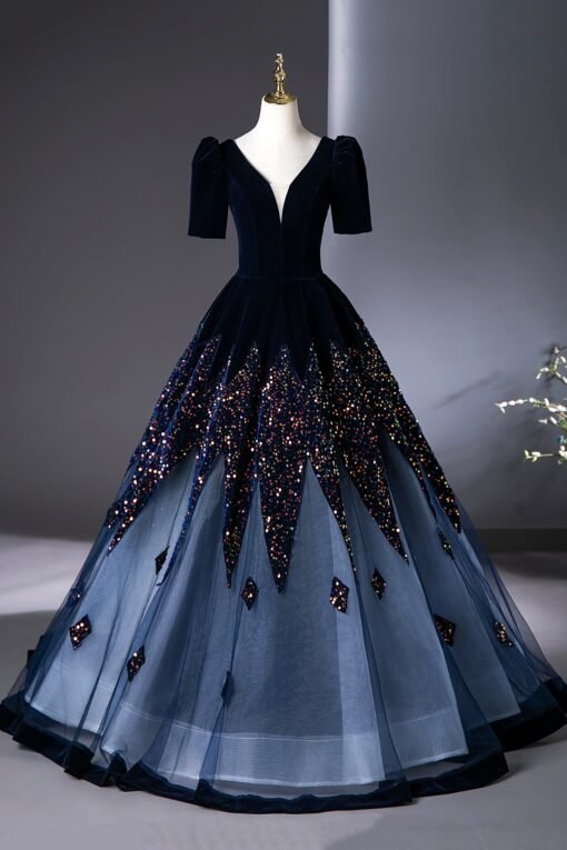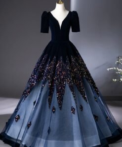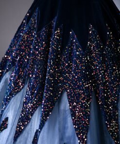 Indulge in the epitome of glamour and sophistication with this Blue V-Neck Velvet and Sequins Floor Length Prom Dress adorned with exquisite beading. This gown is designed to make you feel like a true star at your prom or any grand event.